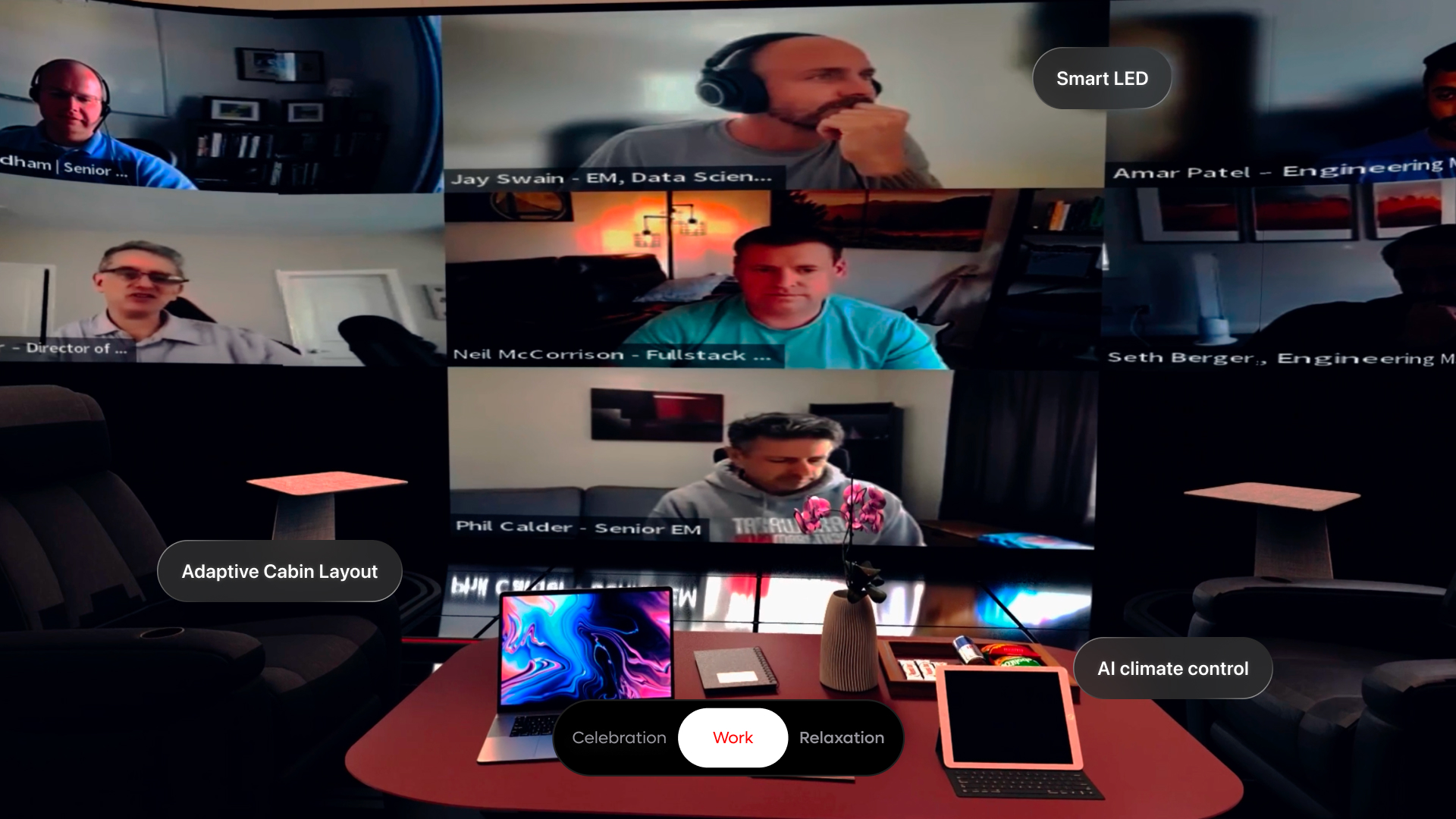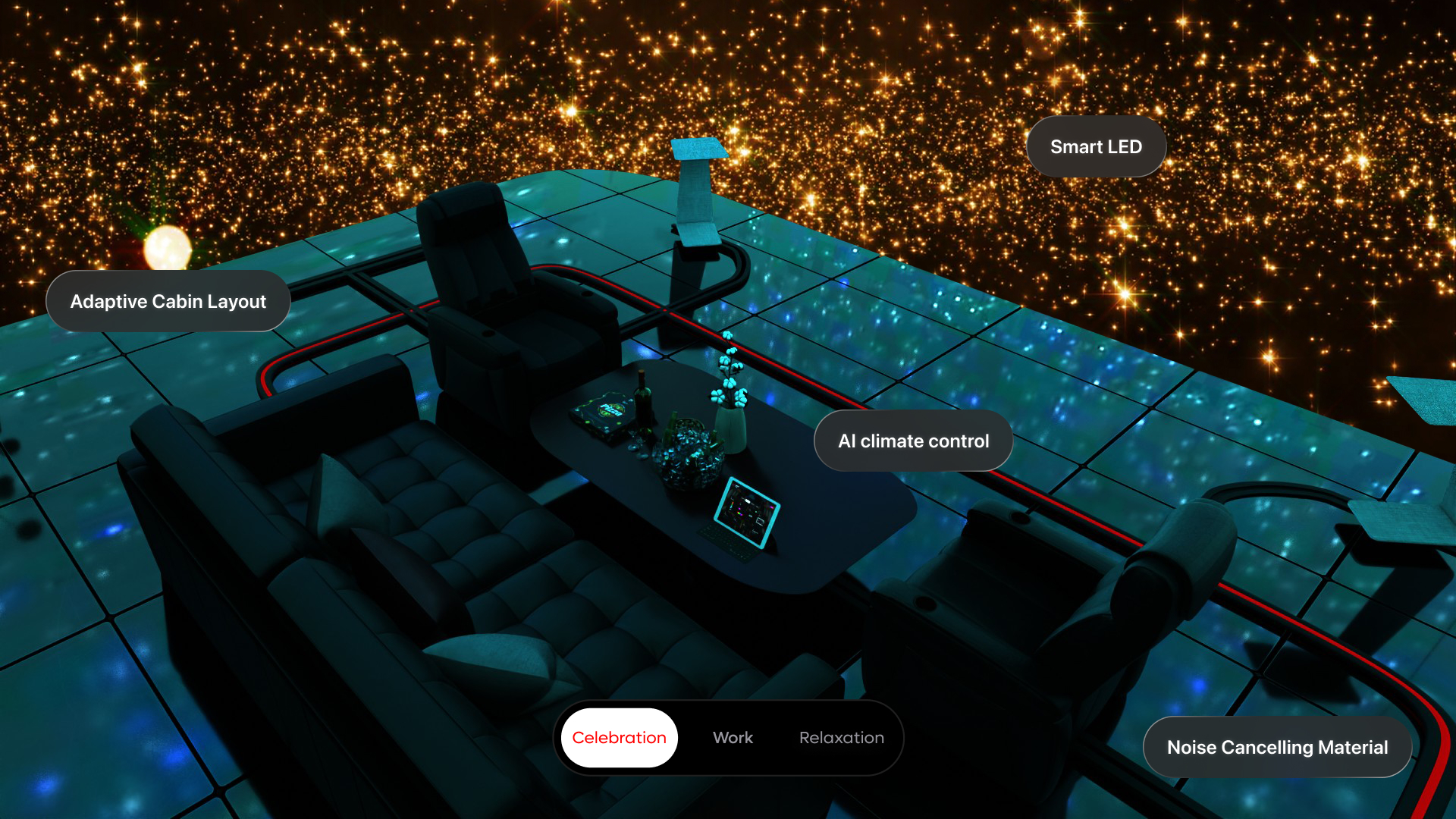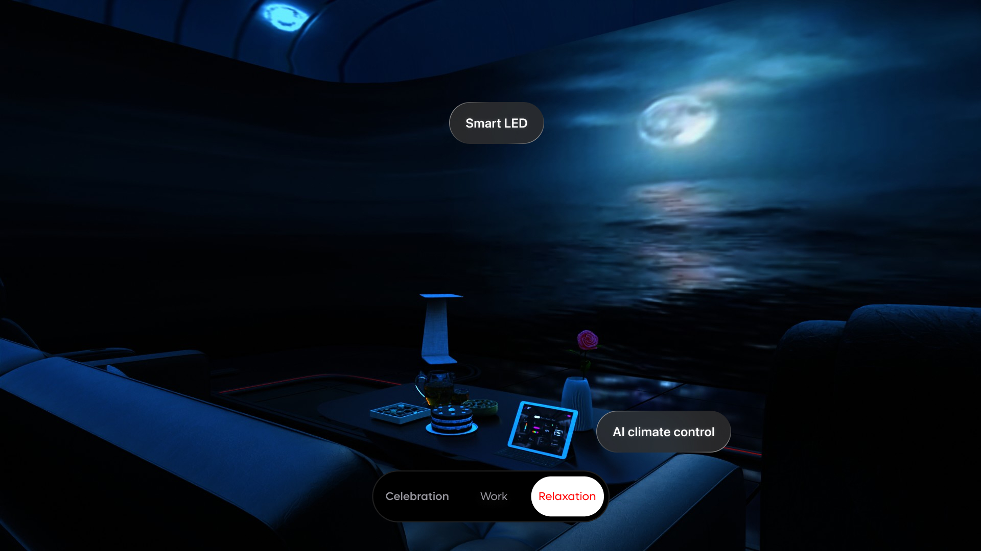 A single private cabin space that transforms based on the passenger's intent. Three modes trigger coordinated changes across Smart LED, AI climate control, noise-cancelling materials, furniture configuration, and display setup. The key design decision: reduce control to a single primary action — mode selection — and let everything else adapt automatically.