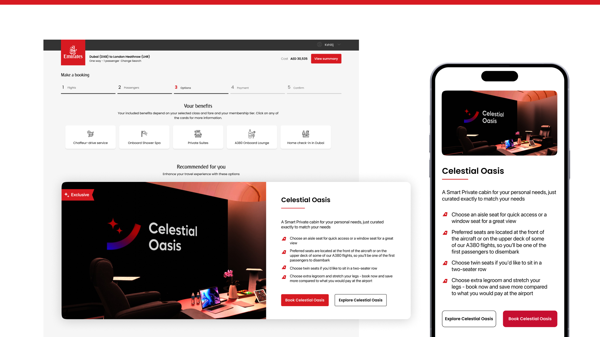 The Celestial Oasis booking integration feels like a tier upgrade discovery, not a commercial prompt. Discovery is surfaced contextually based on fare class and loyalty tier. The sequence: Discovery Card → Explore → Seat Selection → Book. In-flight: one decision (mode), everything else is automatic.