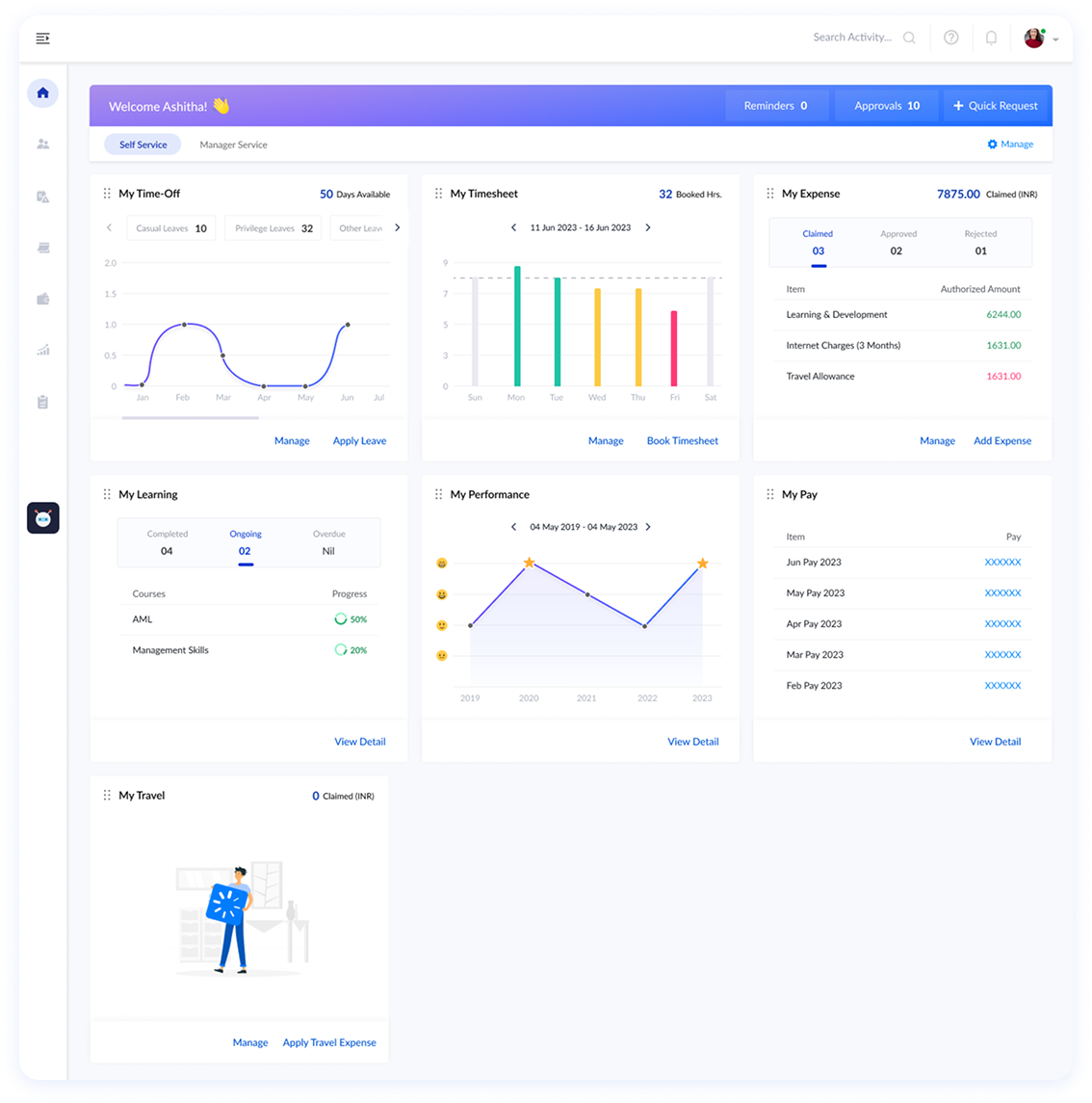 The Employee Self Service dashboard surfaces all key activity areas — Time Off, Timesheet, Expenses, Learning & Development, Performance, and Pay — in a persistent card layout. Each card shows a summary and visualisation so employees can instantly read their status without drilling in. Rapid actions are available directly on the dashboard for frequent tasks. The carousel is gone; everything is visible on load.