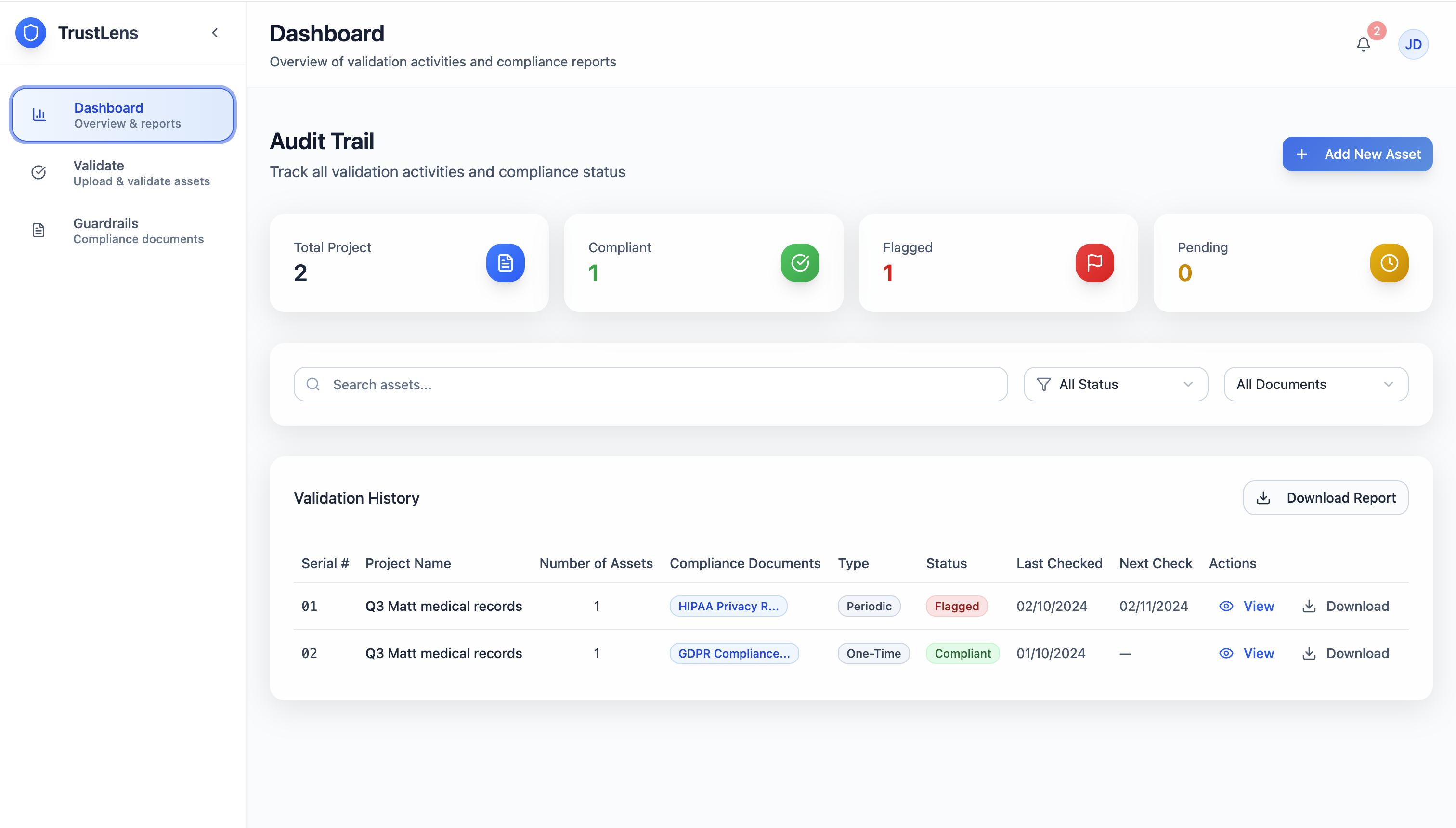 The TrustLens dashboard surfaces compliance status immediately: Total Projects, Compliant, Flagged, Pending — with a Validation History table showing Asset Name, Compliance Document, Type, Status, Last Checked, Next Check, and Actions. Compliance officers need Compliant or Flagged, not confidence intervals. The default view is decision-ready. Drill-down to row-level violations is available when needed. Every validation is timestamped, logged, and exportable as a formal compliance report.
