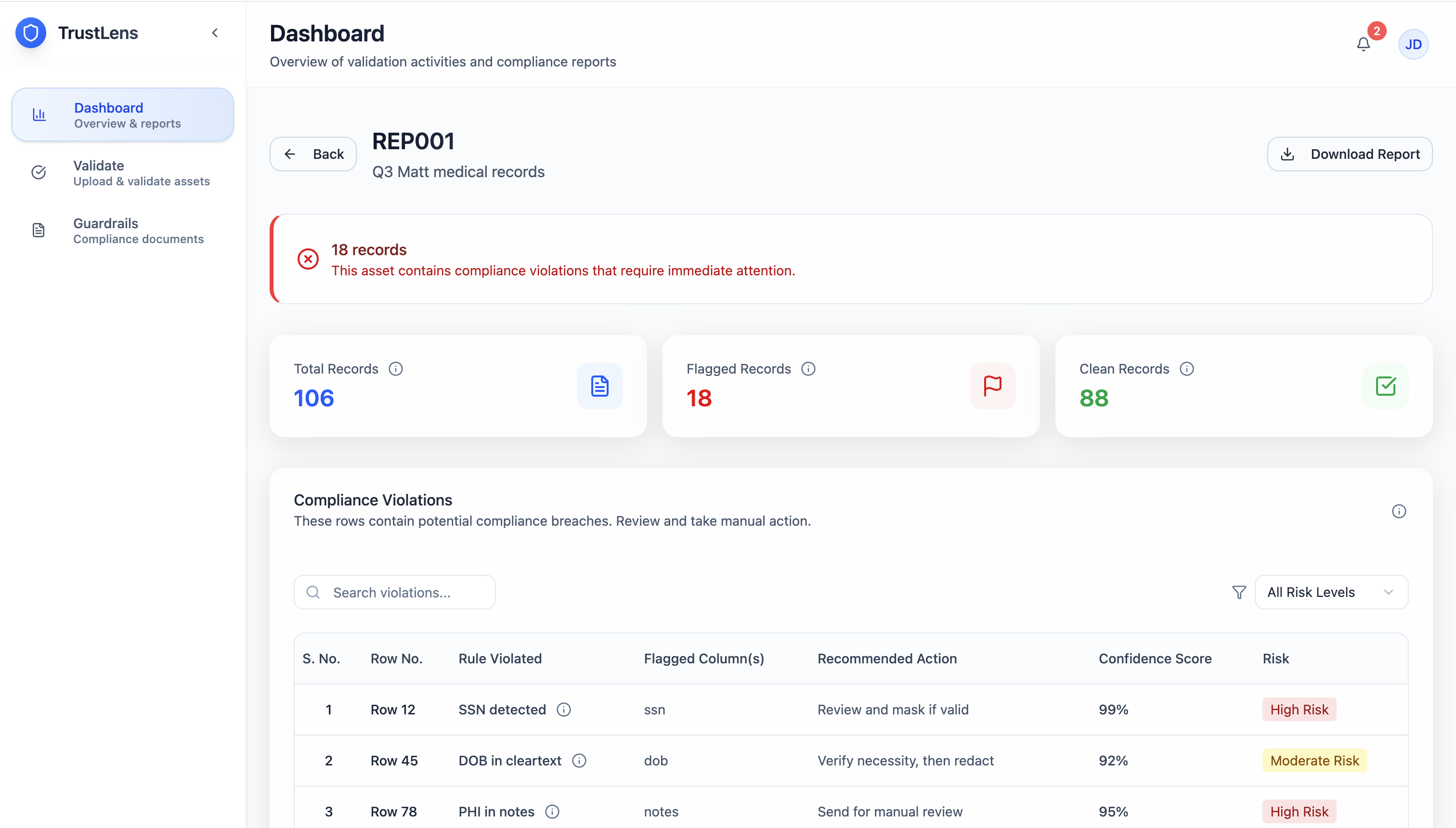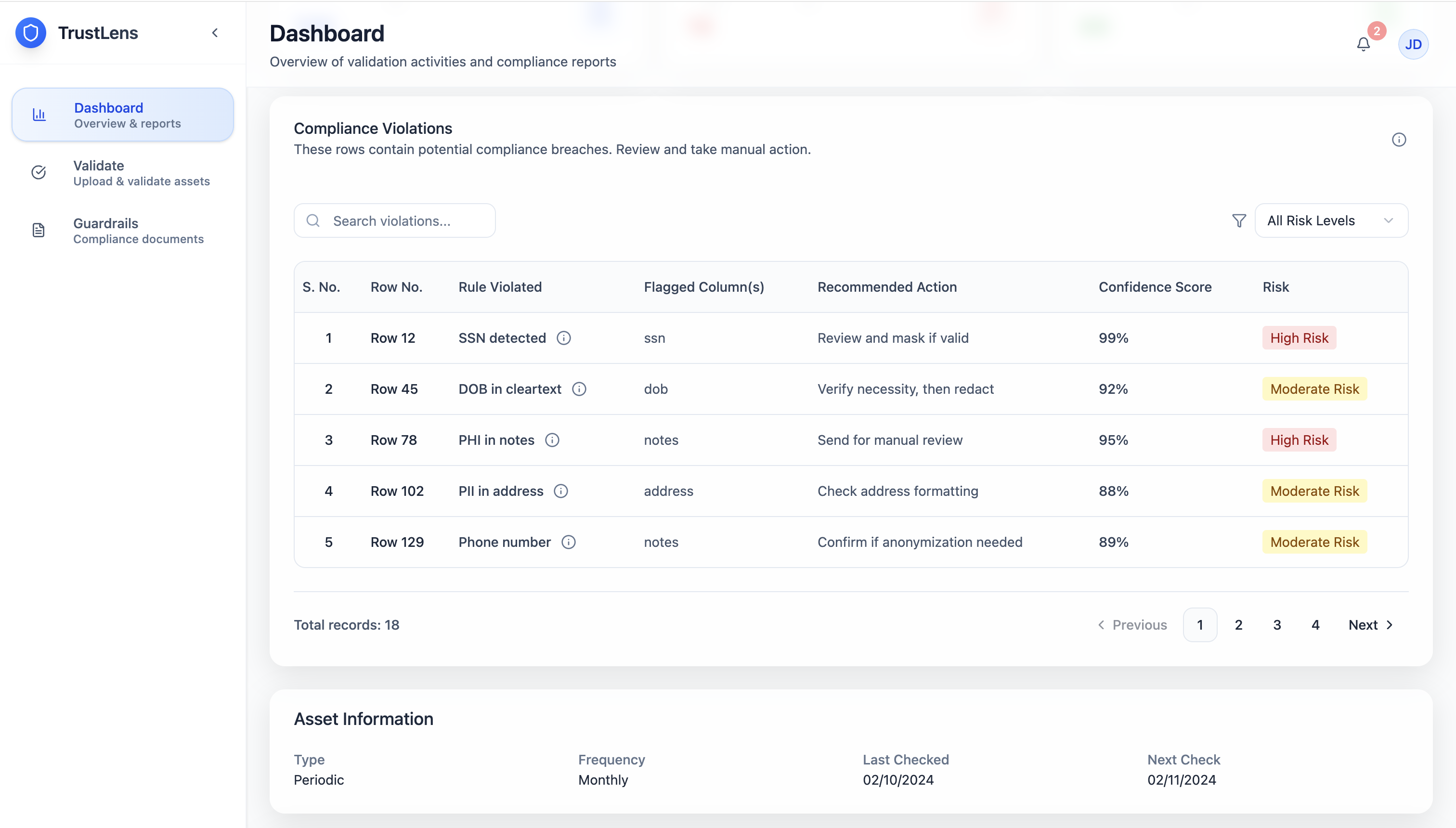 Flagged assets surface a View Violations breakdown: each row is listed with the specific rule violated, the compliance reference (which HIPAA clause), the risk severity score, and the exact flagged columns. The output is structured JSON rendered as a human-readable table — designed so a compliance officer can immediately understand what failed, why, and at what priority. The audit trail logs every check with timestamps for full traceability.