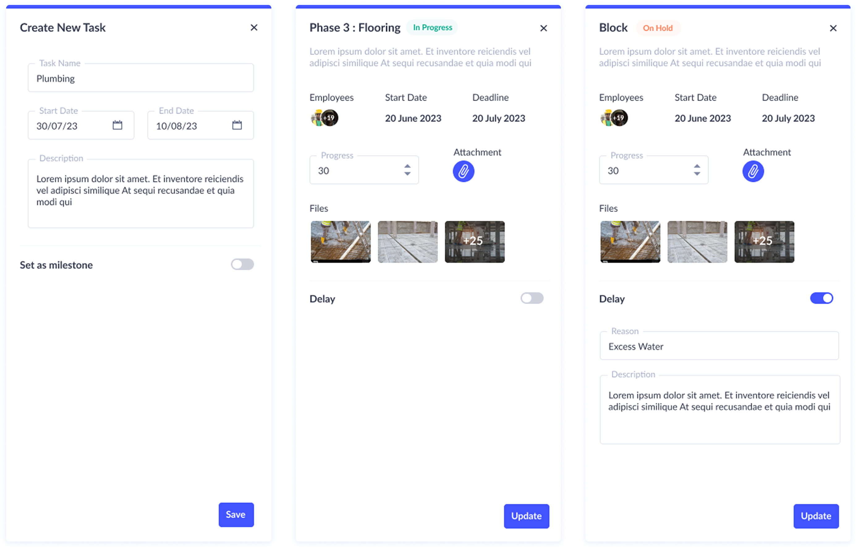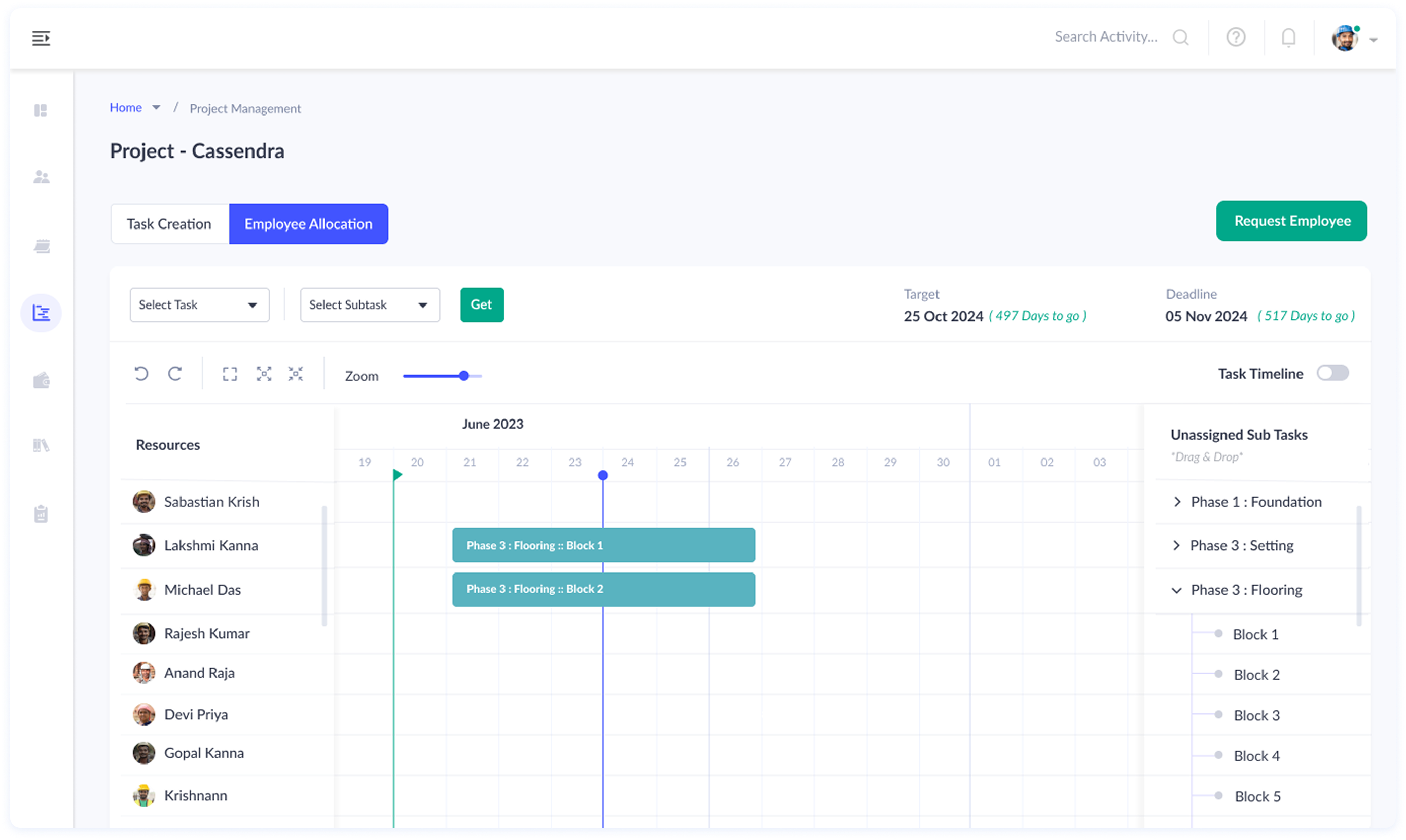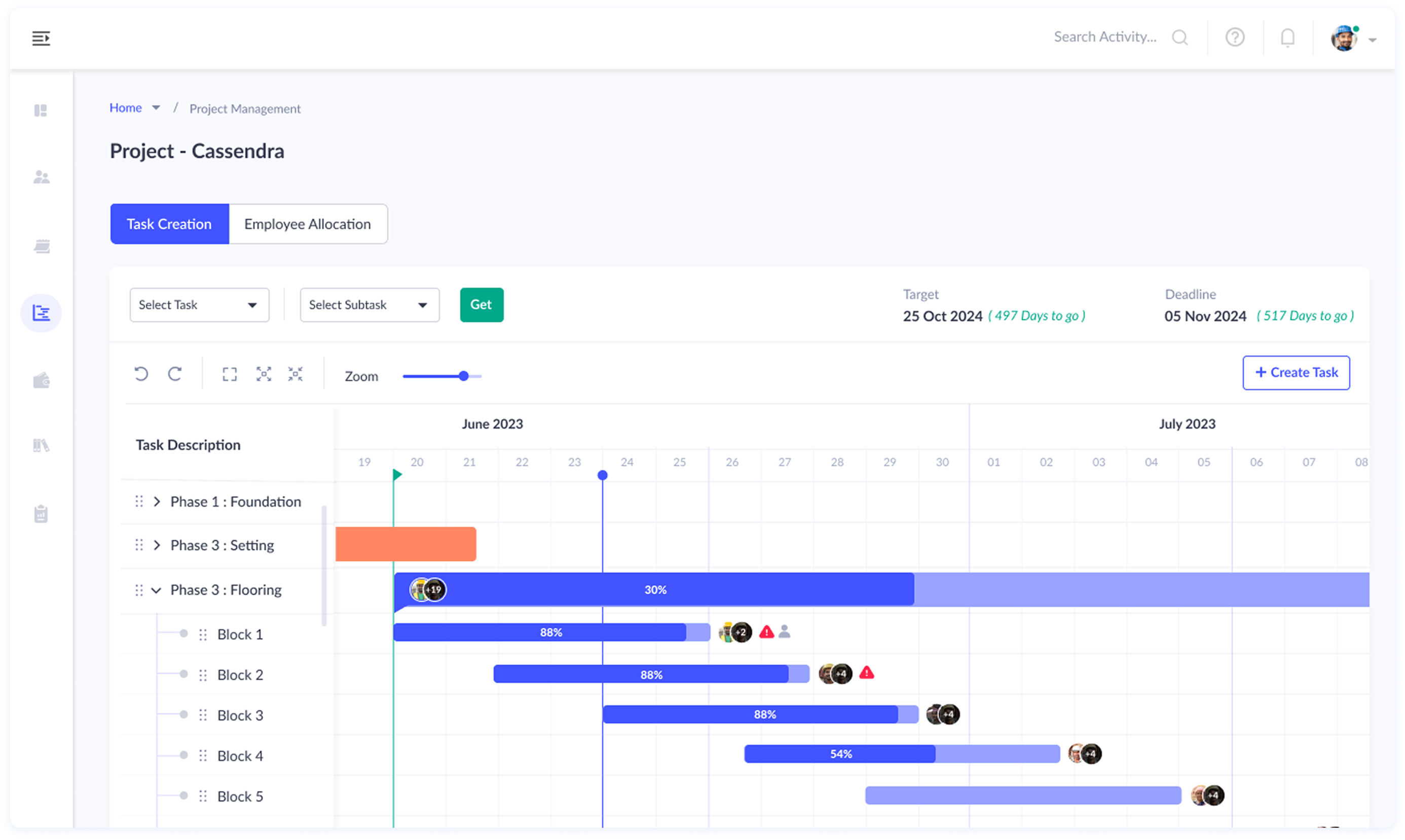 The Gantt chart view gives the Site Manager a timeline-based view of all tasks within the construction project — with the ability to create new tasks, assign employees, set durations, and monitor progress. This directly addresses the HMW around project management efficiency: the manager can see what's on track, what's delayed, and where resource gaps are forming — without having to manage multiple spreadsheets or manually consolidate status from different sources.