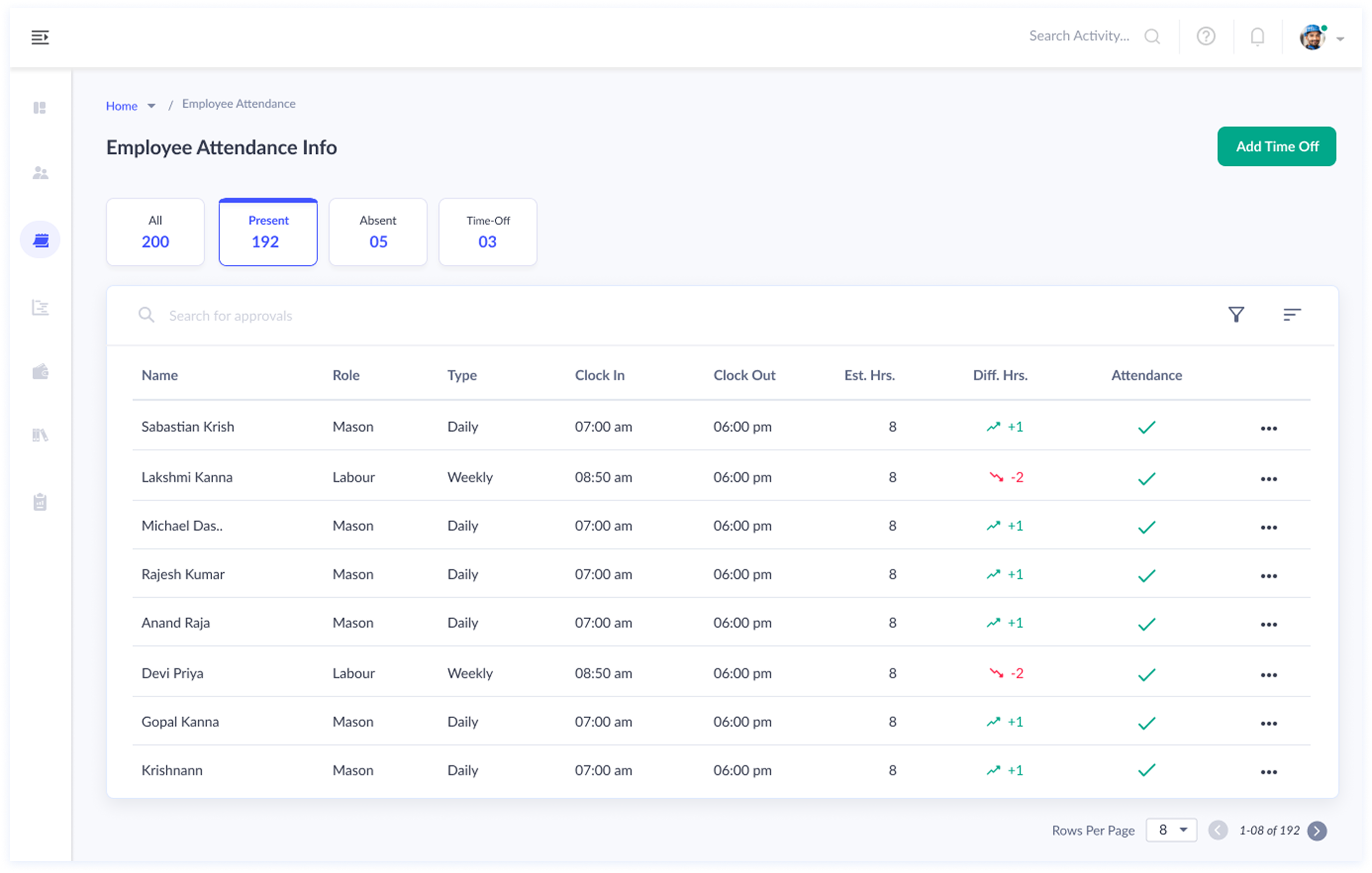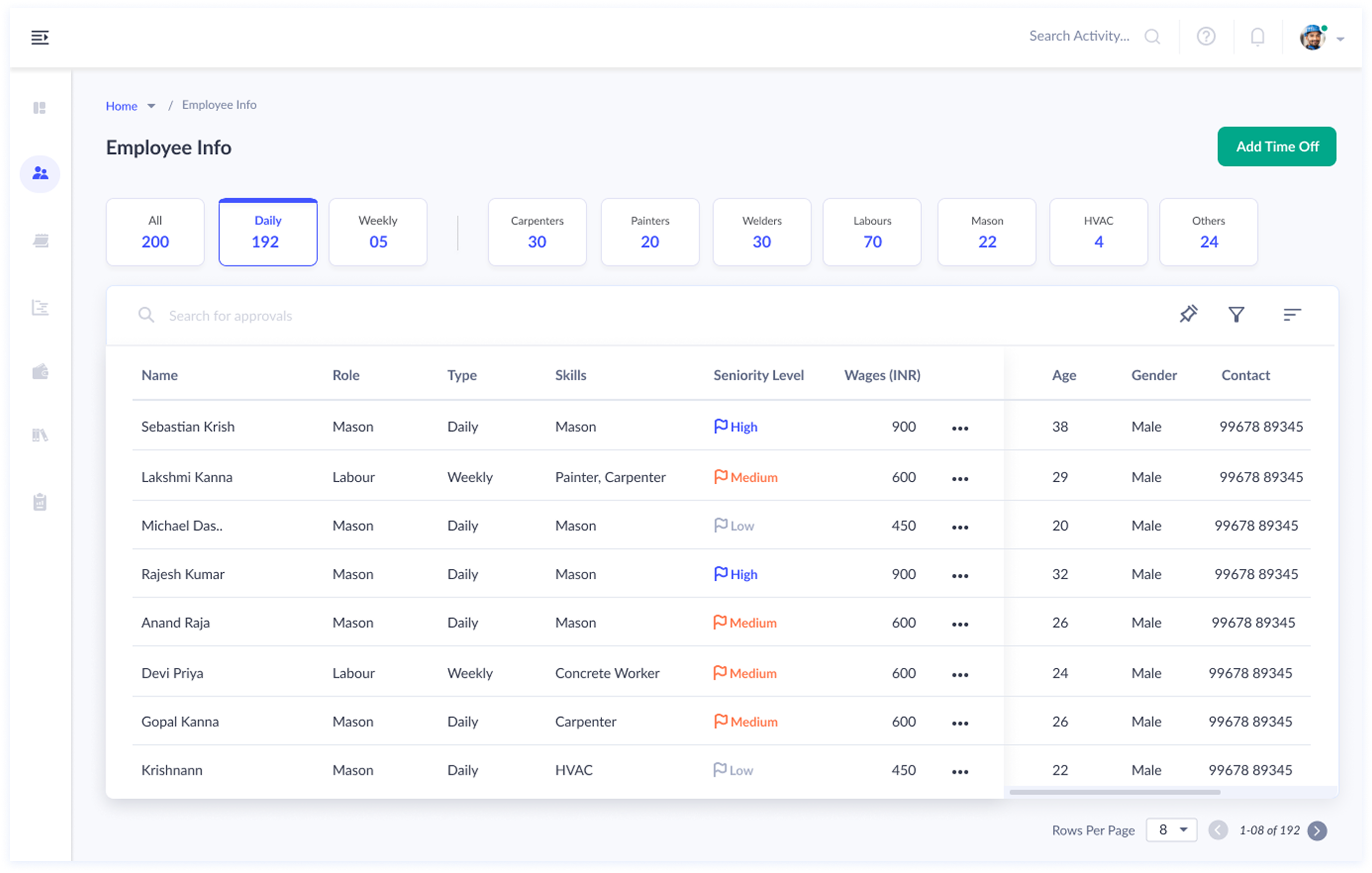 The employee management section consolidates attendance records (fed from biometric clock-ins), planned leave requests, and individual employee information in a single view. The Site Manager can see who is present, who has taken planned leave, and who is absent — and the data feeds directly into wage calculation for the daily and weekly payment cycles.