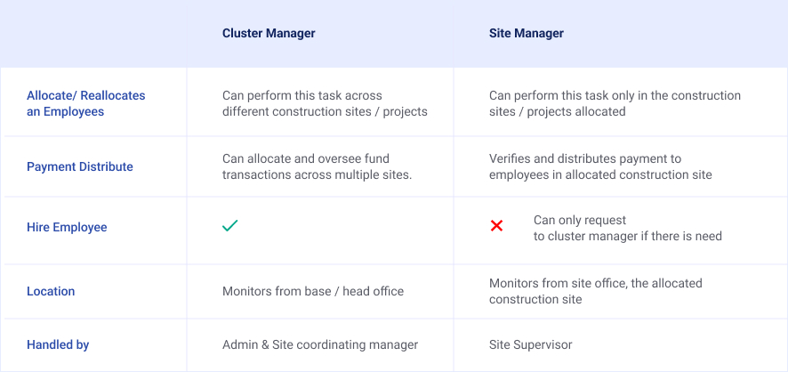 The Cluster Manager operates from the base or head office — managing work across all 10 construction sites, overseeing fund transactions, hiring employees with required skills, and allocating workers to sites. The Site Manager operates from within their assigned site — monitoring progress, assigning tasks, verifying and distributing payments, and reporting to the Cluster Manager. The two roles share a platform but with clearly scoped permissions: the Cluster Manager sees across all sites; the Site Manager acts only within theirs.